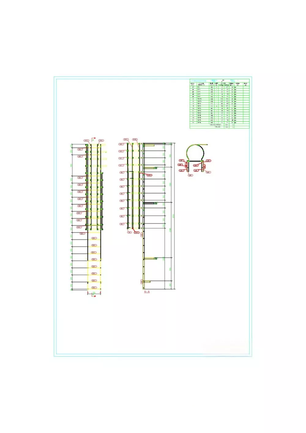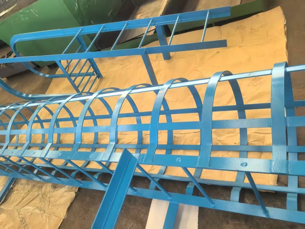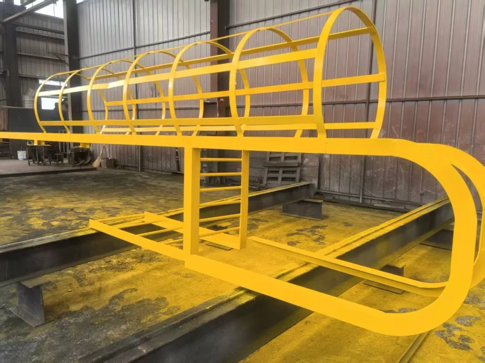 การติดตั้งราวกั้น: สำหรับขั้นบันไดที่มีความสูงเกิน 3 เมตร จะต้องติดตั้งราวกั้นให้สูงจากพื้นดิน 2.5 เมตร เส้นผ่านศูนย์กลางราวกั้นควรอยู่ระหว่าง 700 มม. ถึง 800 มม. วงแหวนแนวนอนควรทำจากเหล็กกลมขนาด 16 มม. โดยมีระยะห่างระหว่างวงแหวน 300 มม. ถึง 450 มม. เหล็กเสริมแนวตั้งต้องทำจากเหล็กกลมหนา 12 มม. โดยมีระยะห่างอย่างน้อย 4 เส้นเท่ากัน ต้องติดตั้งกรงนิรภัยอย่างต่อเนื่องที่ด้านบนของบันไดหรือแท่นพัก ตัวเชื่อมต่อและอุปกรณ์ยึด